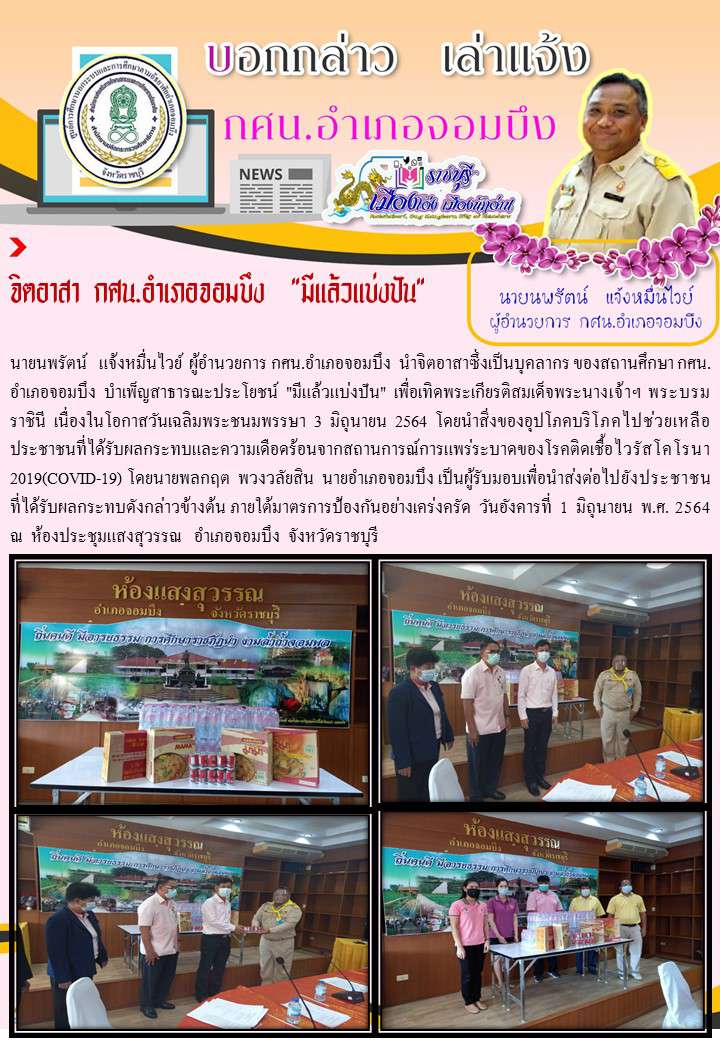 นายนพรัตน์ แจ้งหมื่นไวย์ ผู้อำนวยการ กศน.อำเภอจอมบึง นำจิตอาสาซึ่งเป็นบุคลากร ของสถานศึกษา กศน.อำเภอจอมบึง บำเพ็ญสาธารณะประโยชน์ "มีแล้วแบ่งปัน" เพื่อเทิดพระเกียรติสมเด็จพระนางเจ้าฯ พระบรมราชิน