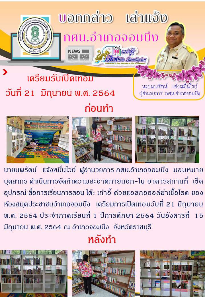 นายนพรัตน์ แจ้งหมื่นไวย์ ผู้อำนวยการ กศน.อำเภอจอมบึง มอบหมายบุคลากร ดำเนินการจัดทำความสะอาดภายนอก-ใน อาคารสถานที่ เช็ดอุปกรณ์ สื่อการเรียนการสอน โต๊ะ เก้าอี้ ด้วยแอลกอฮอล์ฆ่าเชื้อโรค ของ ห้องสมุด