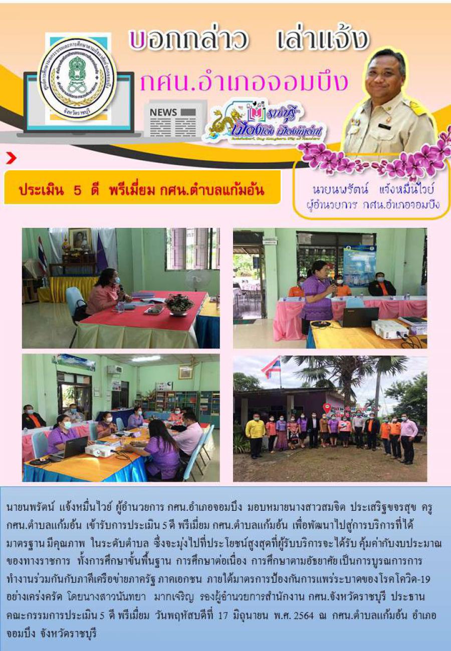 นายนพรัตน์ แจ้งหมื่นไวย์ ผู้อำนวยการ กศน.อำเภอจอมบึง มอบหมายนางสาวสมจิต ประเสริฐขจรสุข ครู กศน.ตำบลแก้มอ้น เข้ารับการประเมิน 5 ดี พรีเมี่ยม กศน.ตำบลแก้มอ้น เพื่อพัฒนาไปสู่การบริการที่ได้มาตรฐาน