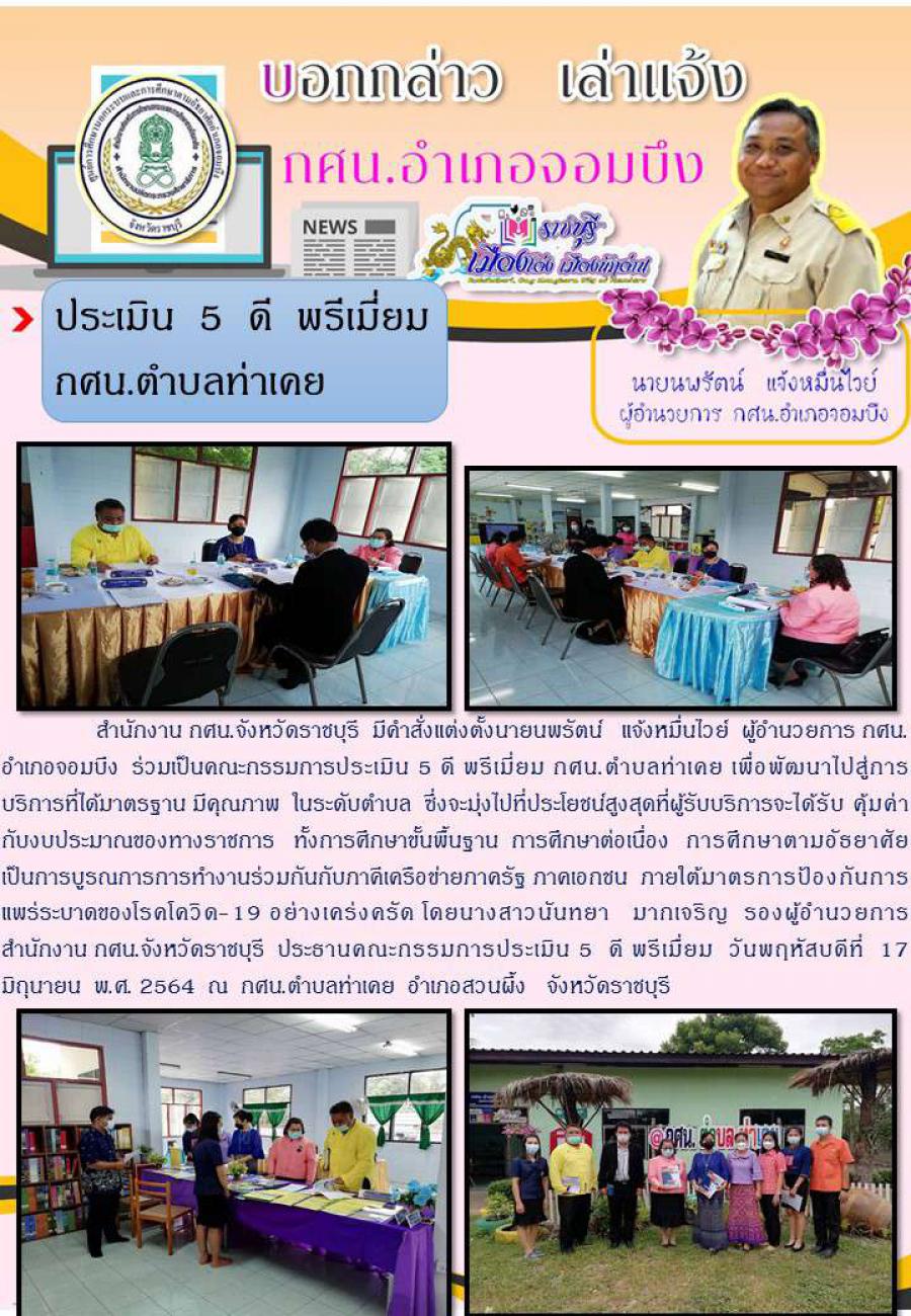 อำเภอจอมบึง ร่วมเป็นคณะกรรมการประเมิน 5 ดี พรีเมี่ยม กศน.ตำบลท่าเคย เพื่อพัฒนาไปสู่การบริการที่ได้มาตรฐาน มีคุณภาพ ในระดับตำบล ซึ่งจะมุ่งไปที่ประโยชน์สูงสุดที่ผู้รับบริการจะได้รับ คุ้มค่ากับงบประมา
