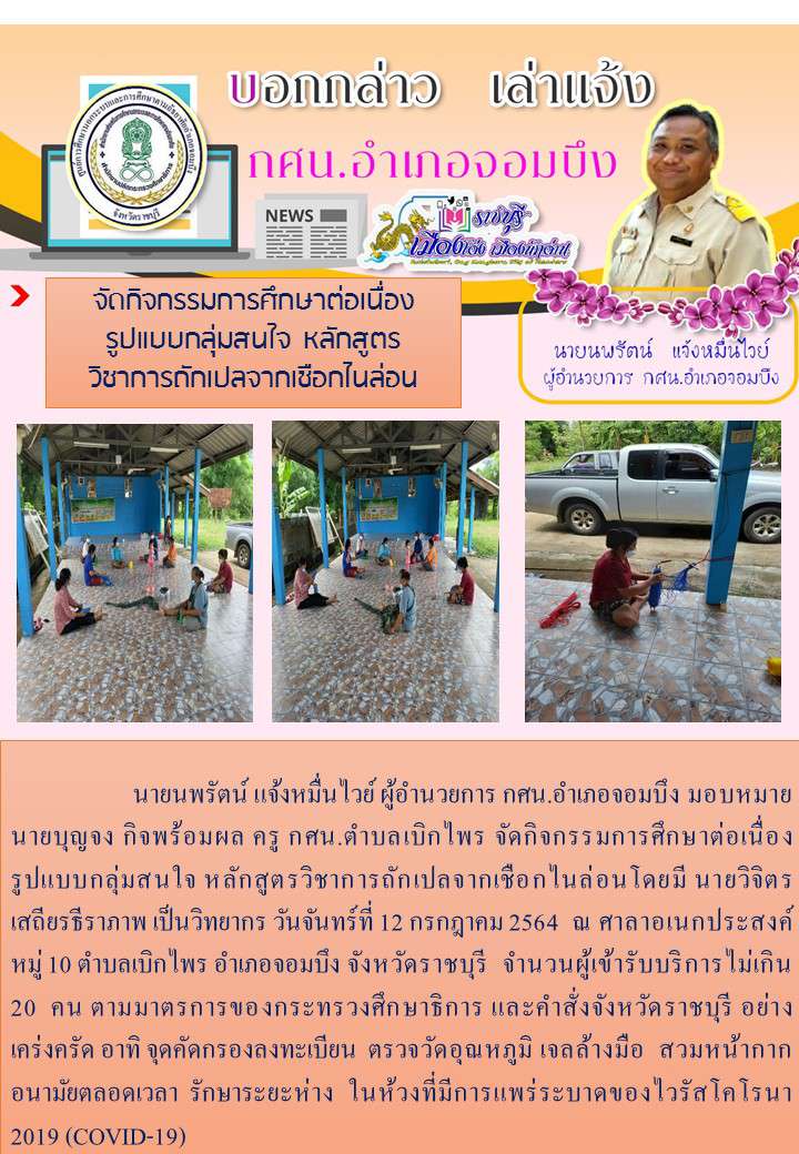 นายนพรัตน์ แจ้งหมื่นไวย์ ผู้อำนวยการ กศน.อำเภอจอมบึง มอบหมาย นายบุญจง กิจพร้อมผล ครู กศน.ตำบลเบิกไพร จัดกิจกรรมการศึกษาต่อเนื่อง รูปแบบกลุ่มสนใจ หลักสูตรวิชาการถักเปลจากเชือกไนล่อน