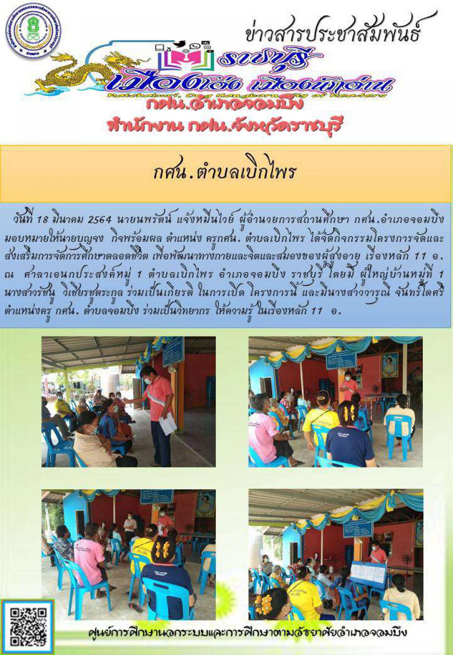 กศน.อำเภอจอมบึง:งานการศึกษาต่อเนื่อง กศน.ตำบลเบิกไพร จัดกิจกรรมโครงการจัดเเละส่งเสริมการจัดการศึกษาตลอดชีวิต