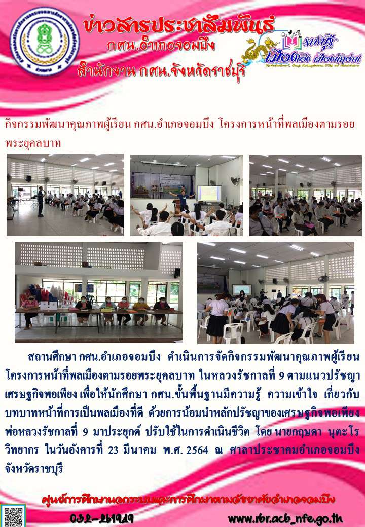 กศน.อำเภอจอมบึง:งานการศึกษาขั้นพื้นฐาน กิจกรรมพัฒนาคุณภาพผู้เรียน กศน.อำเภอจอมบึง โครงการหน้าที่พลเมืองตามรอยพระยุคลบาท ในหลวงรัชกาลที่ 9 ตามแนวปรัชญา เศรษฐกิจพอเพียง