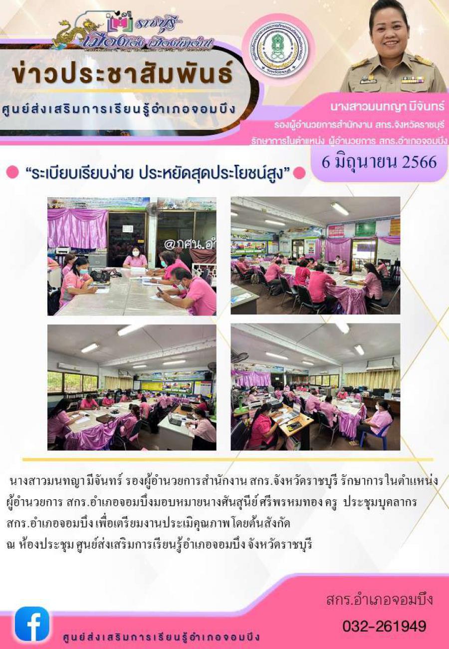 นางสาวมนทญา มีจันทร์ รองผู้อำนวยการสำนักงาน สกร.จังหวัดราชบุรี รักษาการในตำแหน่งผู้อำนวยการ สกร.อำเภอจอมบึงมอบหมายนางศันสุนีย์ ศรีพรหมทอง ครู ประชุมบุคลากร สกร.อำเภอจอมบึง เพื่อเตรียมงานประเมิคุณภาพโ