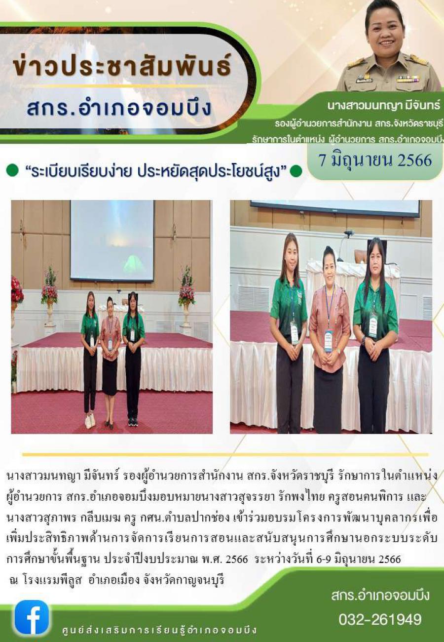 นางสาวมนทญา มีจันทร์ รองผู้อำนวยการสำนักงาน สกร.จังหวัดราชบุรี รักษาการในตำแหน่งผู้อำนวยการ สกร.อำเภอจอมบึงมอบหมายนางสาวสุจรรยา รักพงไทย ครูสอนคนพิการ และ นางสาวสุภาพร กลีบเมฆ ครู กศน.ตำบลปากช่อง เข้า
