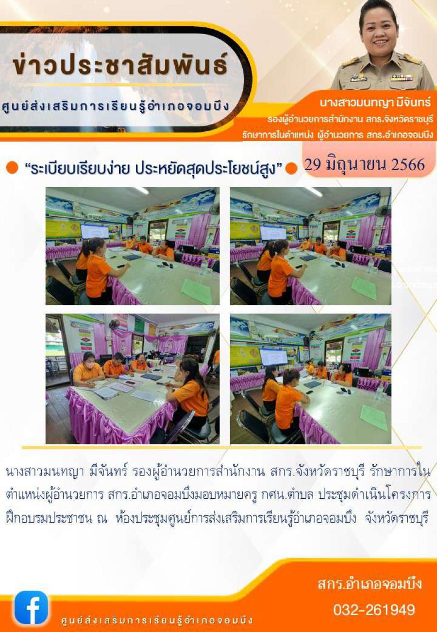 นางสาวมนทญา มีจันทร์ รองผู้อำนวยการสำนักงาน สกร.จังหวัดราชบุรี รักษาการในตำแหน่งผู้อำนวยการ สกร.อำเภอจอมบึงมอบหมายครู กศน.ตำบล ประชุมดำเนินโครงการฝึกอบรมประชาชน ณ ห้องประชุมศูนย์การส่งเสริมการเรียนรู