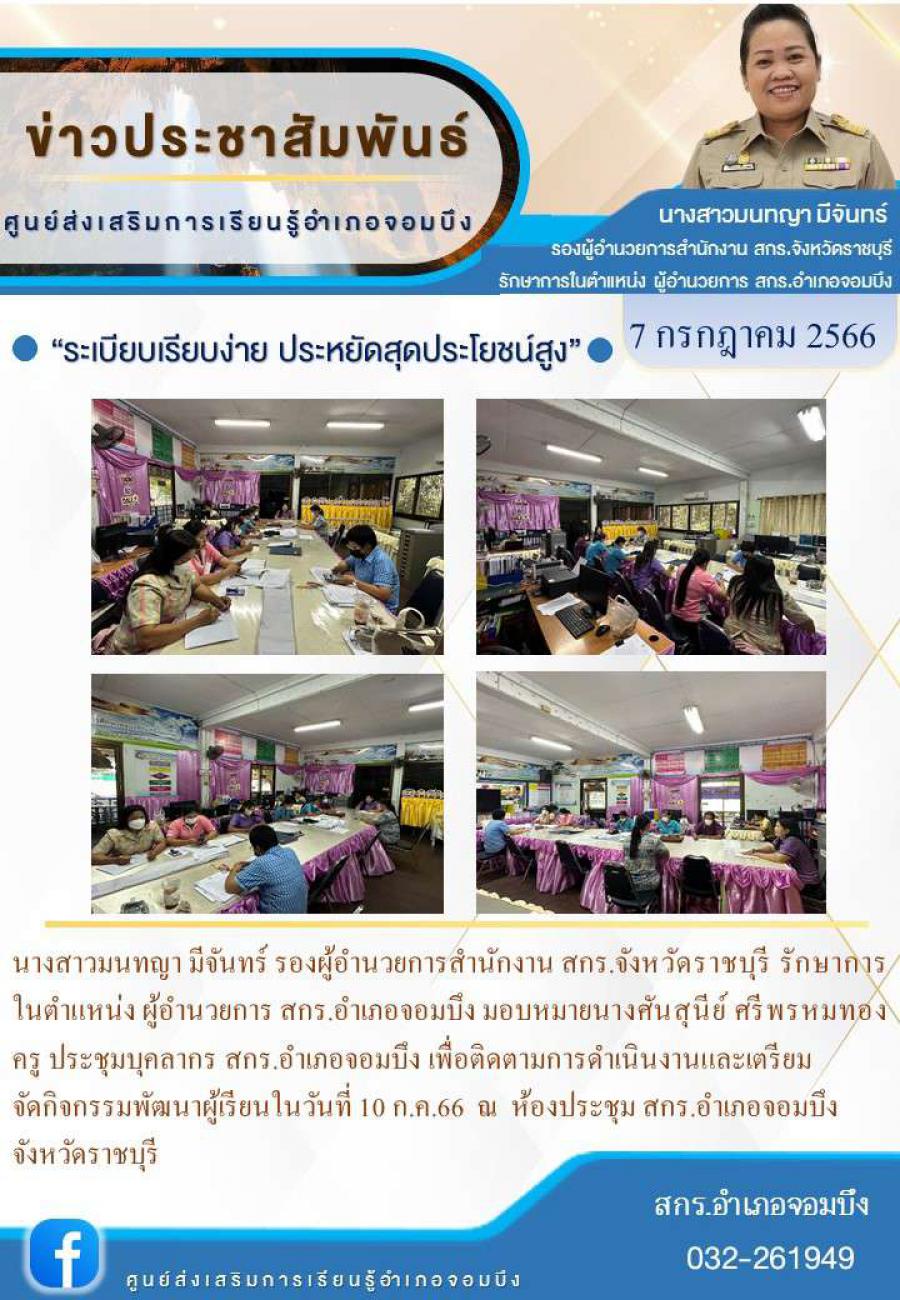 นางสาวมนทญา มีจันทร์ รองผู้อำนวยการสำนักงาน สกร.จังหวัดราชบุรี รักษาการในตำแหน่ง ผู้อำนวยการ สกร.อำเภอจอมบึง มอบหมายนางศันสุนีย์ ศรีพรหมทอง ครู ประชุมบุคลากร สกร.อำเภอจอมบึง เพื่อติดตามการดำเนินงานและ