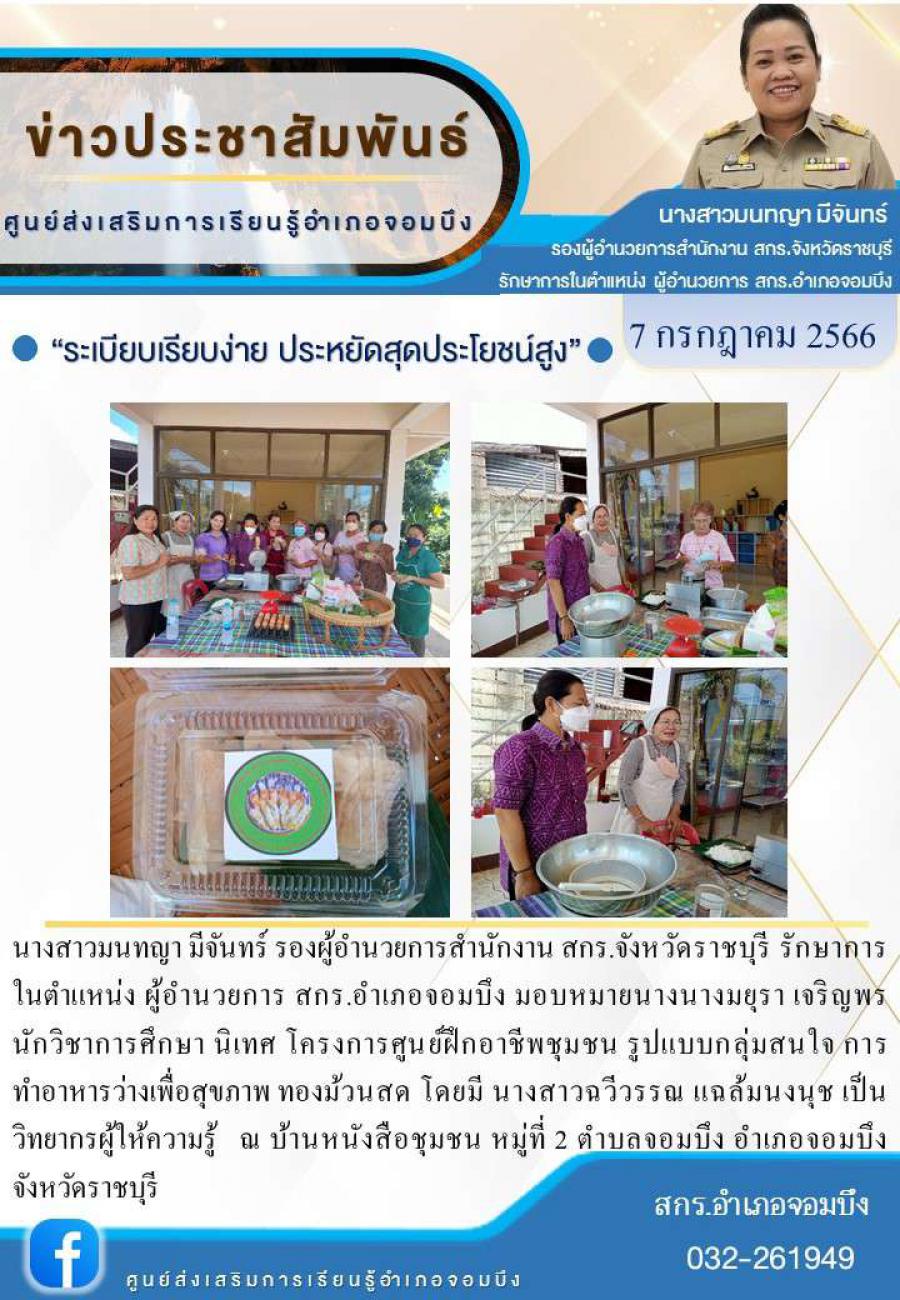 นางสาวมนทญา มีจันทร์ รองผู้อำนวยการสำนักงาน สกร.จังหวัดราชบุรี รักษาการในตำแหน่ง ผู้อำนวยการ สกร.อำเภอจอมบึง มอบหมายนางนางมยุรา เจริญพร นักวิชาการศึกษา นิเทศ โครงการศูนย์ฝึกอาชีพชุมชน รูปแบบกลุ่มสนใจ