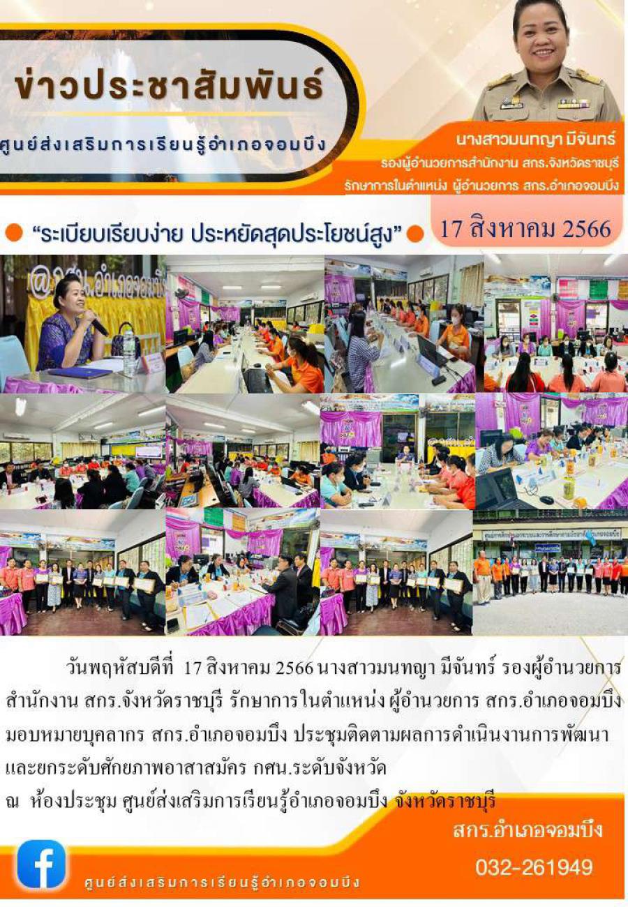 วันพฤหัสบดีที่ 17 สิงหาคม 2566 นางสาวมนทญา มีจันทร์ รองผู้อำนวยการสำนักงาน สกร.จังหวัดราชบุรี รักษาการในตำแหน่ง ผู้อำนวยการ สกร.อำเภอจอมบึง มอบหมายบุคลากร สกร.อำเภอจอมบึง ประชุมติดตามผล