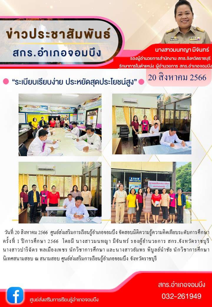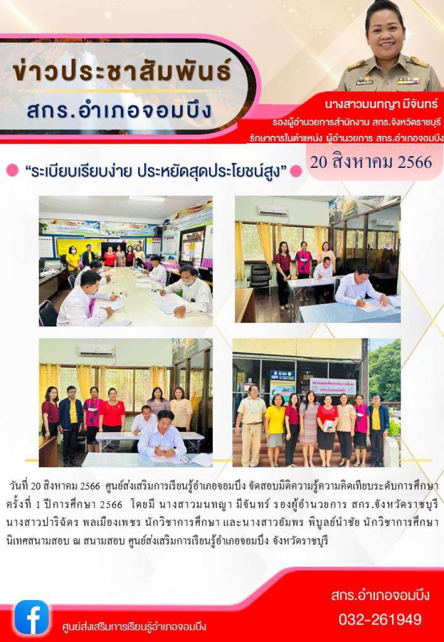 วันที่ 20 สิงหาคม 2566 ศูนย์ส่งเสริมการเรียนรู้อำเภอจอมบึง จัดสอบมิติความรู้ความคิด?เทียบระดับการศึกษา? ครั้งที่ 1 ปีการศึกษา 2566? ? โดยมี นางสาวมนทญา มีจันทร์ รองผู้อำนวยการ สกร.จังหวัดราชบุรี นางส