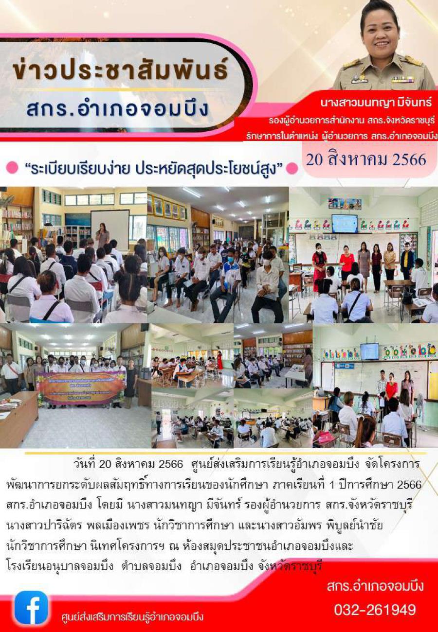 วันที่ 20 สิงหาคม 2566 ศูนย์ส่งเสริมการเรียนรู้อำเภอจอมบึง จัดโครงการ พัฒนาการยกระดับผลสัมฤทธิ์ทางการเรียนของนักศึกษา ภาคเรียนที่ 1 ปีการศึกษา 2566 สกร.อำเภอจอมบึง ?โดยมี นางสาวมนท
