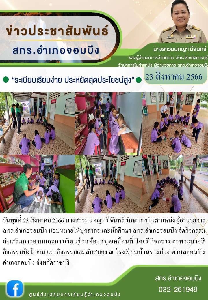 วันพุธที่ 23 สิงหาคม 2566 นางสาวมนทญา มีจันทร์ รักษาการในตำแหน่ง ผู้อำนวยการ สกร.อำเภอจอมบึง มอบหมายให้บุคลากรและนักศึกษา สกร.อำเภอจอมบึง จัดกิจกรรมส่งเสริมการอ่านและการเรียนรู้รถห้องสมุดเคลื่อนที่ โ