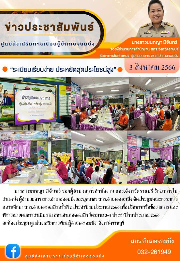 นางสาวมนทญา มีจันทร์ รองผู้อำนวยการสำนักงาน สกร.จังหวัดราชบุรี รักษาการในตำแหน่ง ผู้อำนวยการ สกร.อำเภอจอมบึงและบุคลากร สกร.อำเภอจอมบึง จัดประชุมคณะกรรมการสถานศึกษา สกร.อำเภอจอมบึง ครั้งที่ 2 ประจำปีงบ