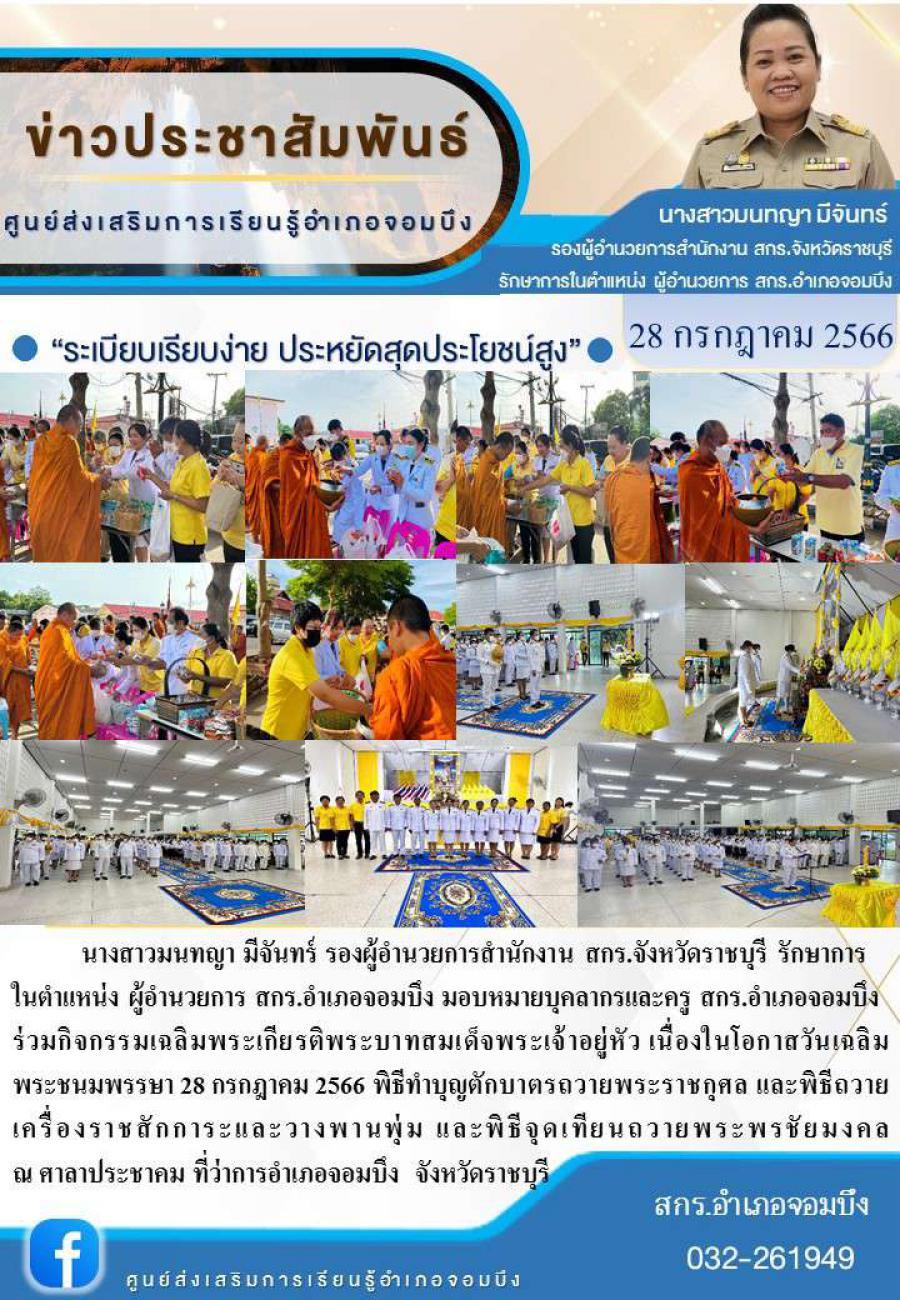 นางสาวมนทญา มีจันทร์ รองผู้อำนวยการสำนักงาน สกร.จังหวัดราชบุรี รักษาการ ในตำแหน่ง ผู้อำนวยการ สกร.อำเภอจอมบึง มอบหมายบุคลากรและครู สกร.อำเภอจอมบึง ร่วมกิจกรรมเฉลิมพระเกียรติพระบาทสมเด็จพระเ
