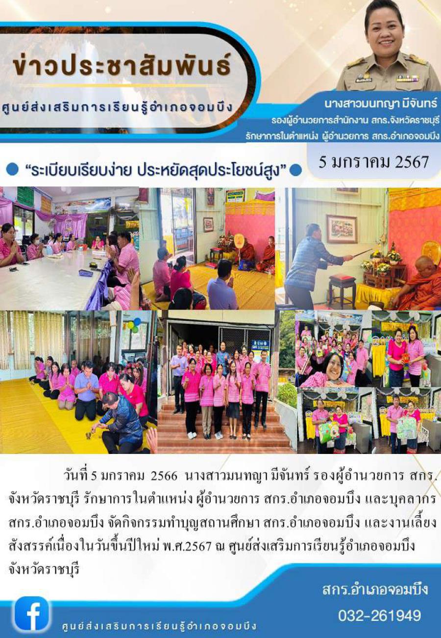 วันที่ 5 มกราคม 2566 นางสาวมนทญา มีจันทร์ รองผู้อำนวยการ สกร.จังหวัดราชบุรี รักษาการในตำแหน่ง ผู้อำนวยการ สกร.อำเภอจอมบึง และบุคลากร สกร.อำเภอจอมบึง จัดกิจกรรมทำบุญสถานศึกษา สกร.อำ