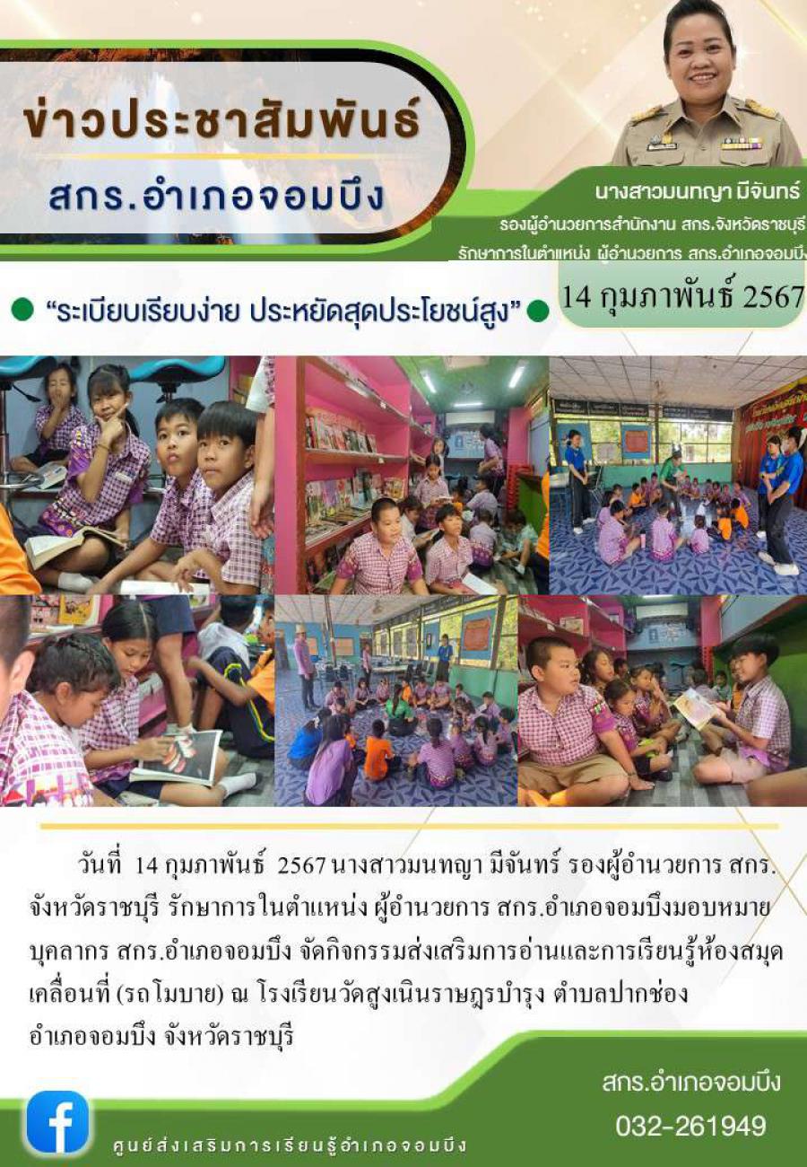 วันที่ 14 กุมภาพันธ์ 2567 นางสาวมนทญา มีจันทร์ รองผู้อำนวยการ สกร. จังหวัดราชบุรี รักษาการในตำแหน่ง ผู้อำนวยการ สกร.อำเภอจอมบึงมอบหมาย บุคลากร สกร.อำเภอจอมบึง จัดกิจกรรมส่งเสริมการอ่านและกา