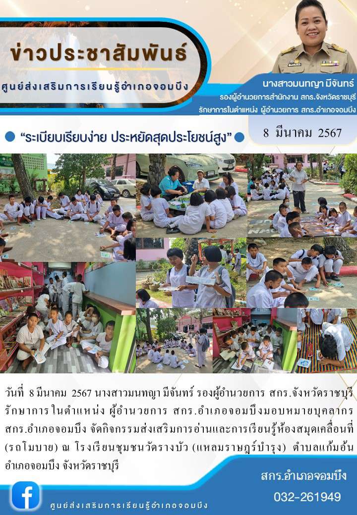 วันที่ 8 มีนาคม 2567 นางสาวมนทญา มีจันทร์ รองผู้อำนวยการ สกร.จังหวัดราชบุรี รักษาการในตำแหน่ง ผู้อำนวยการ สกร.อำเภอจอมบึงมอบหมายบุคลากร สกร.อำเภอจอมบึง จัดกิจกรรมส่งเสริมการอ่านและการเรียนรู้ห้องสม