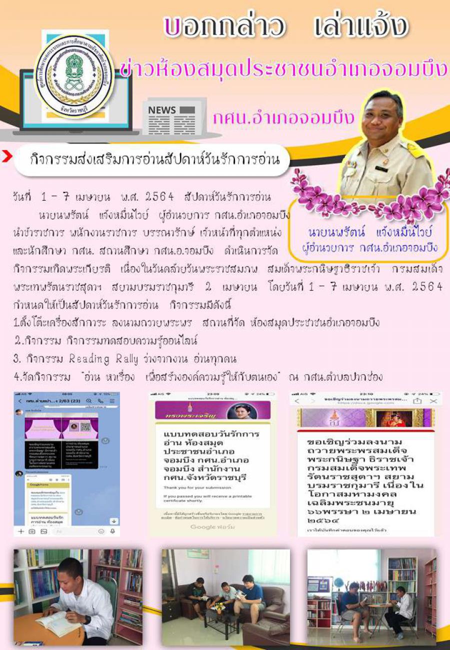 กศน.อำเภอจอมบึง:งานการศึกษาตามอัธยาศัย ห้องสมุดประชาชนอำเภอจอมบึง กิจกรรมส่งเสริมการอ่านสัปดาห์การรักการอ่าน